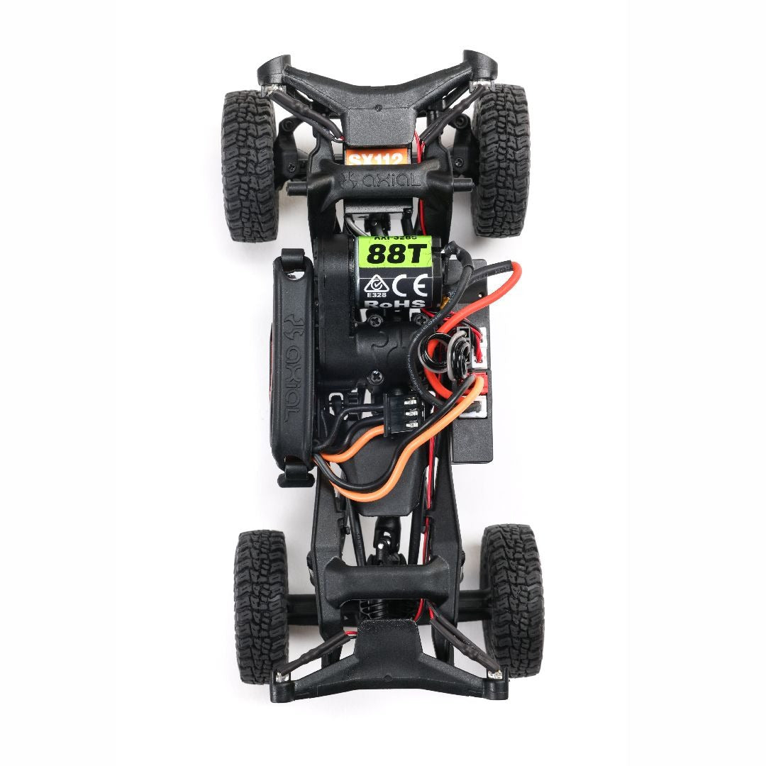At 1/30 scale, the Axial SCX30 Ford Bronco RTR is perfectly sized for crawling across your desktop or on outdoor dirt and rock trails. It delivers oversized performance with advanced features such as an angled skid plate for sliding over obstacles, ramped axle housings, high clearance links, forward weight bias for climbing stability, damped shocks, and full ball bearings. A powerful Axial 88T motor and Spektrum electronics—mounted low in the chassis—enhance control and durability.