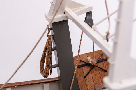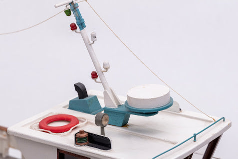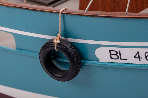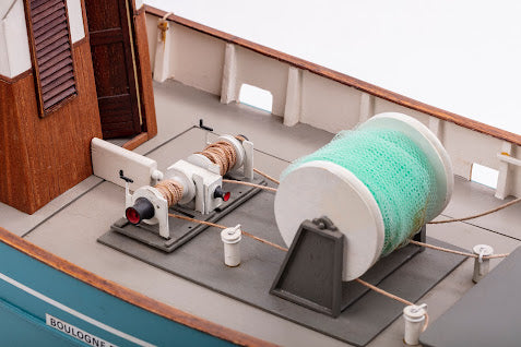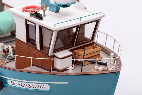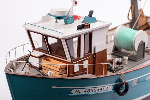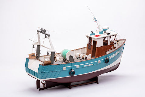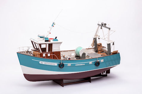 This original design can be seen in many ports along the French Channel. The boats are socalled stern trawlers, in which the net is pulled in using a tricing line in the rear of the boat. The hull is of steel; and the length is 11 m.