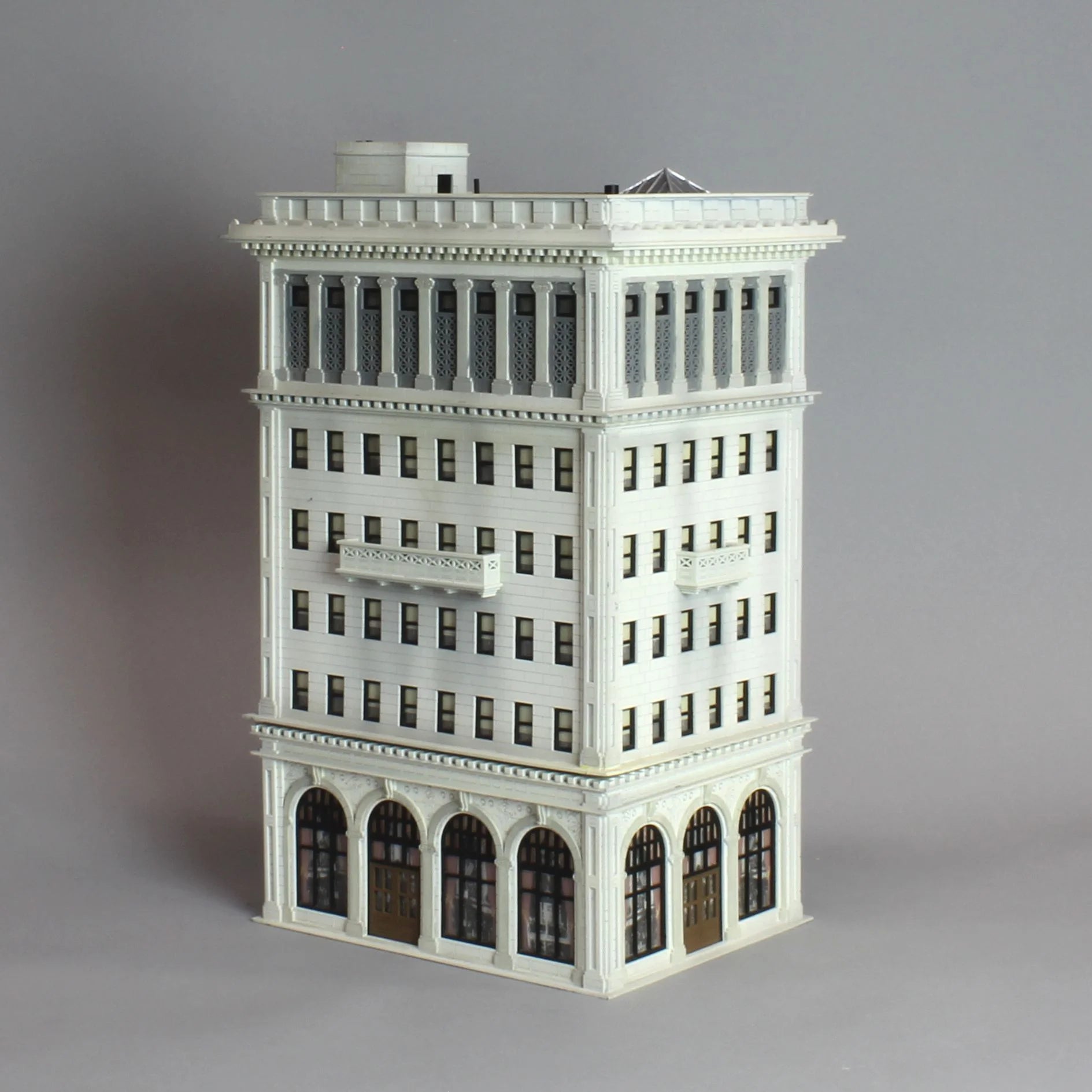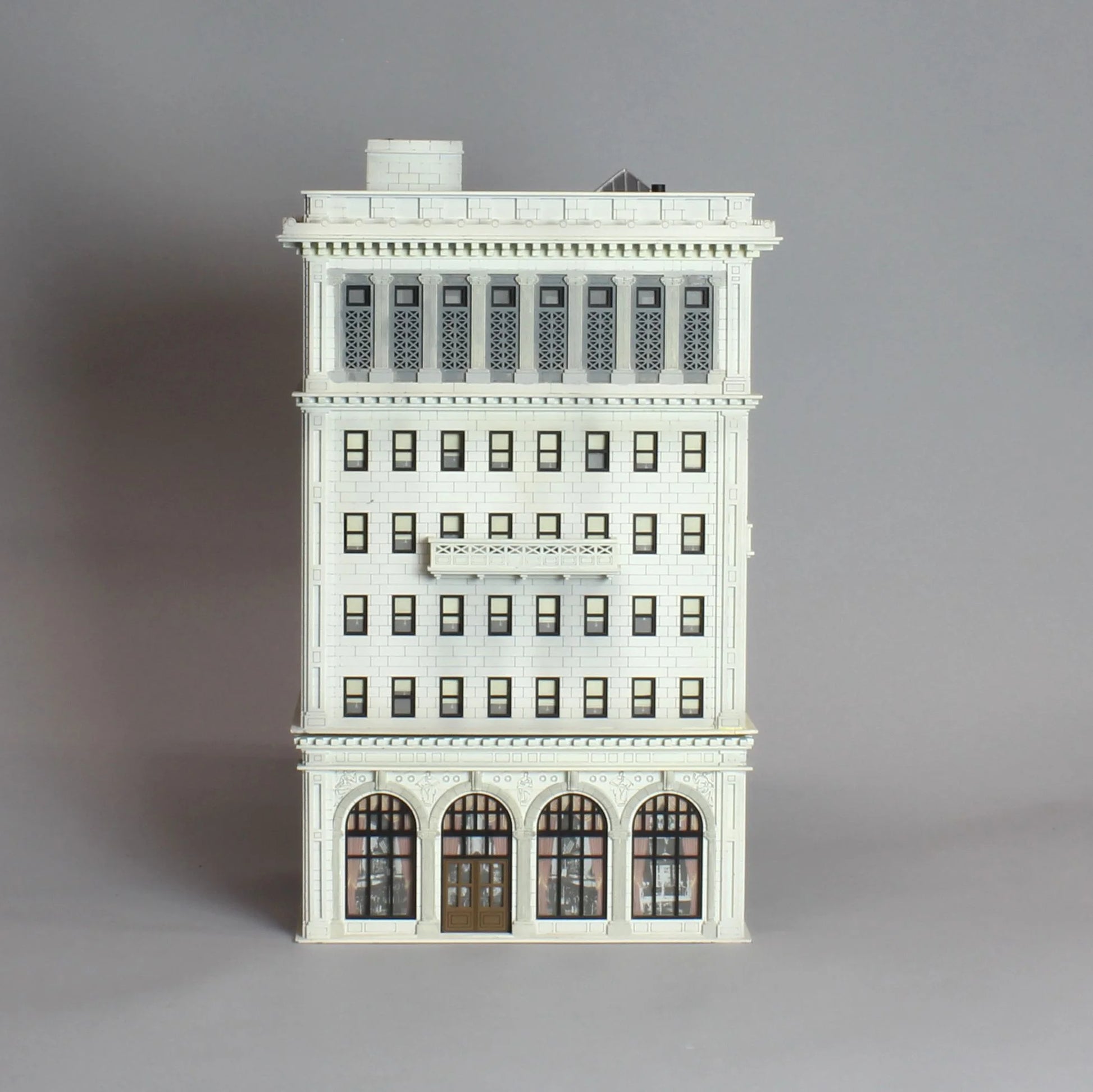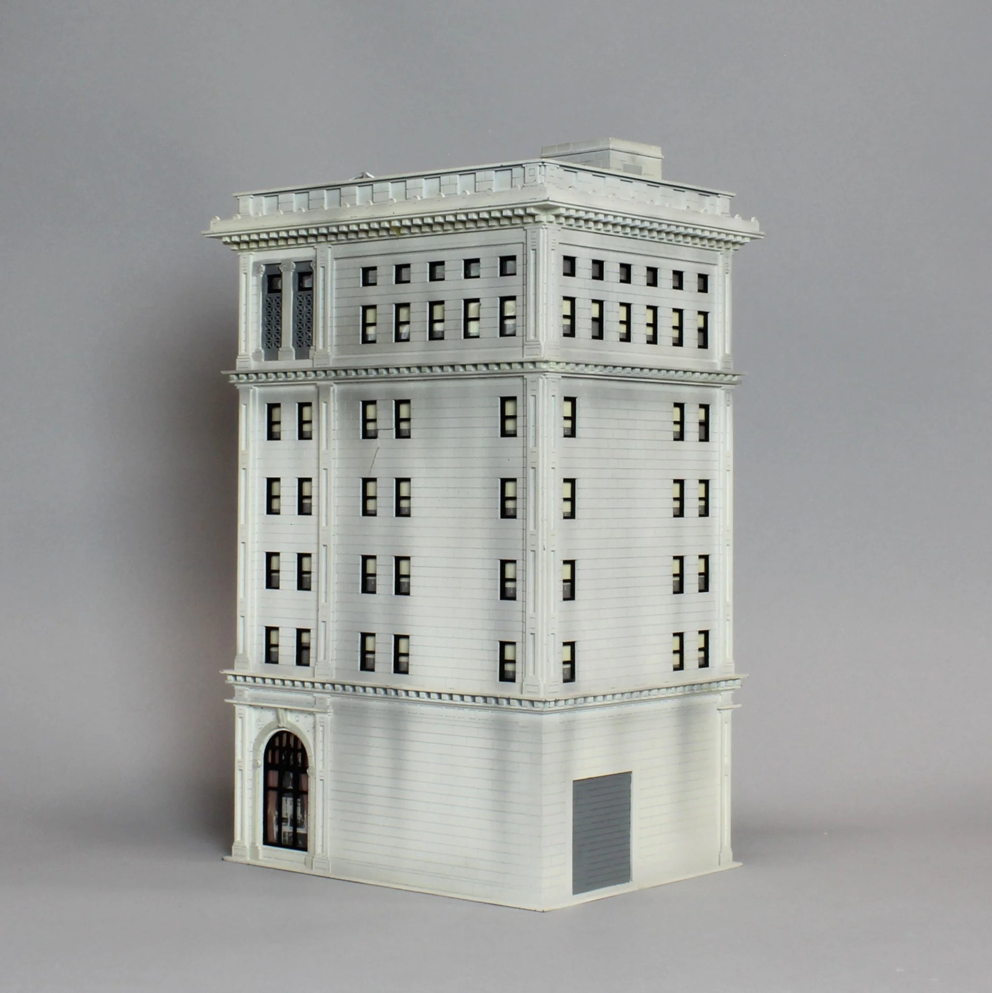 Kit features laser cut acrylic parts, tab and slot construction, printed window shades and sidewalks.