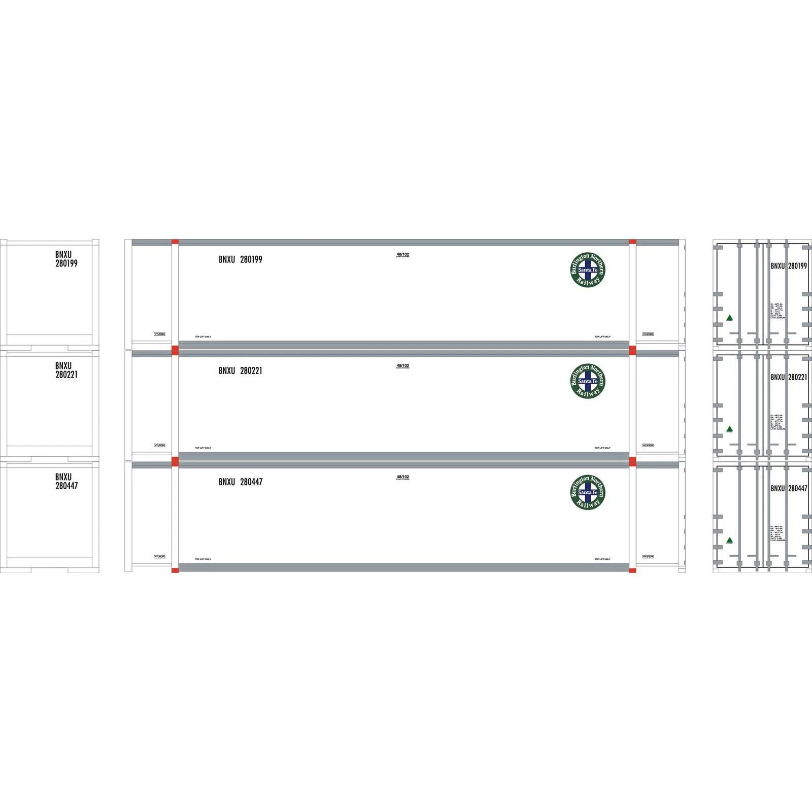 The Athearn ATH17302 is a three‑pack of 48‑foot intermodal containers decorated for BNSF (reporting mark BNXU). These containers suit modern‑era N scale layouts and work well with Husky Stack cars and other intermodal rolling stock.