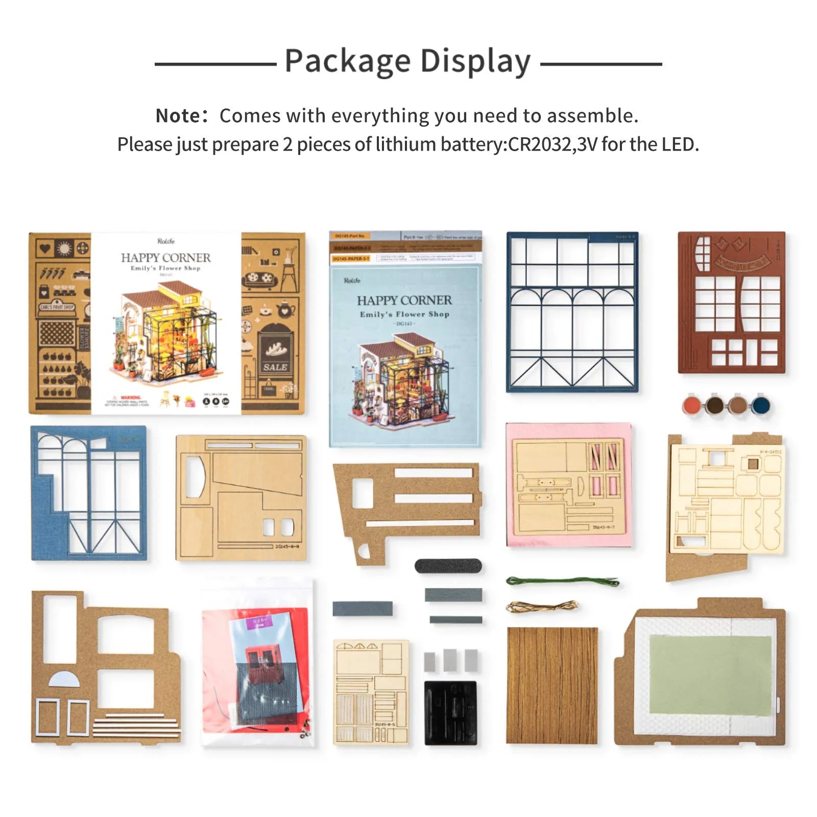 Rolife Emily's Flower Shop DG145 captures a charming corner of your neighborhood. Whether it's morning or after work, you can buy a beautiful bouquet for the day. Crafting plants and glass windows piece by piece, and making mini furniture with your own hands, you'll have a relaxing time finishing this artwork!