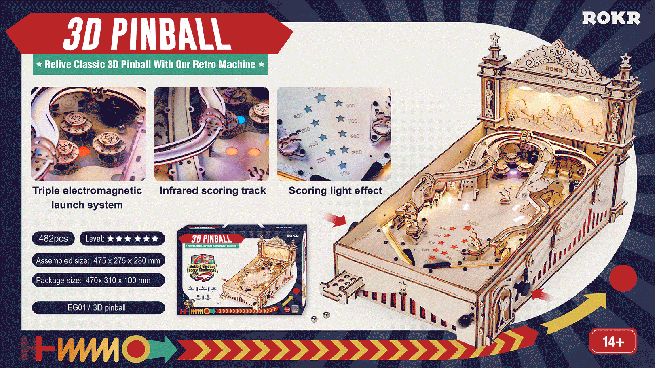 With all the transmission model, live sound & light effect, electronic scoring and other exquisite detail design, this ROKR 3D pinball puzzle will bring you so much fun playing on your own or interacting with family and friends. Try to survive as long as you can and score as many as possible!