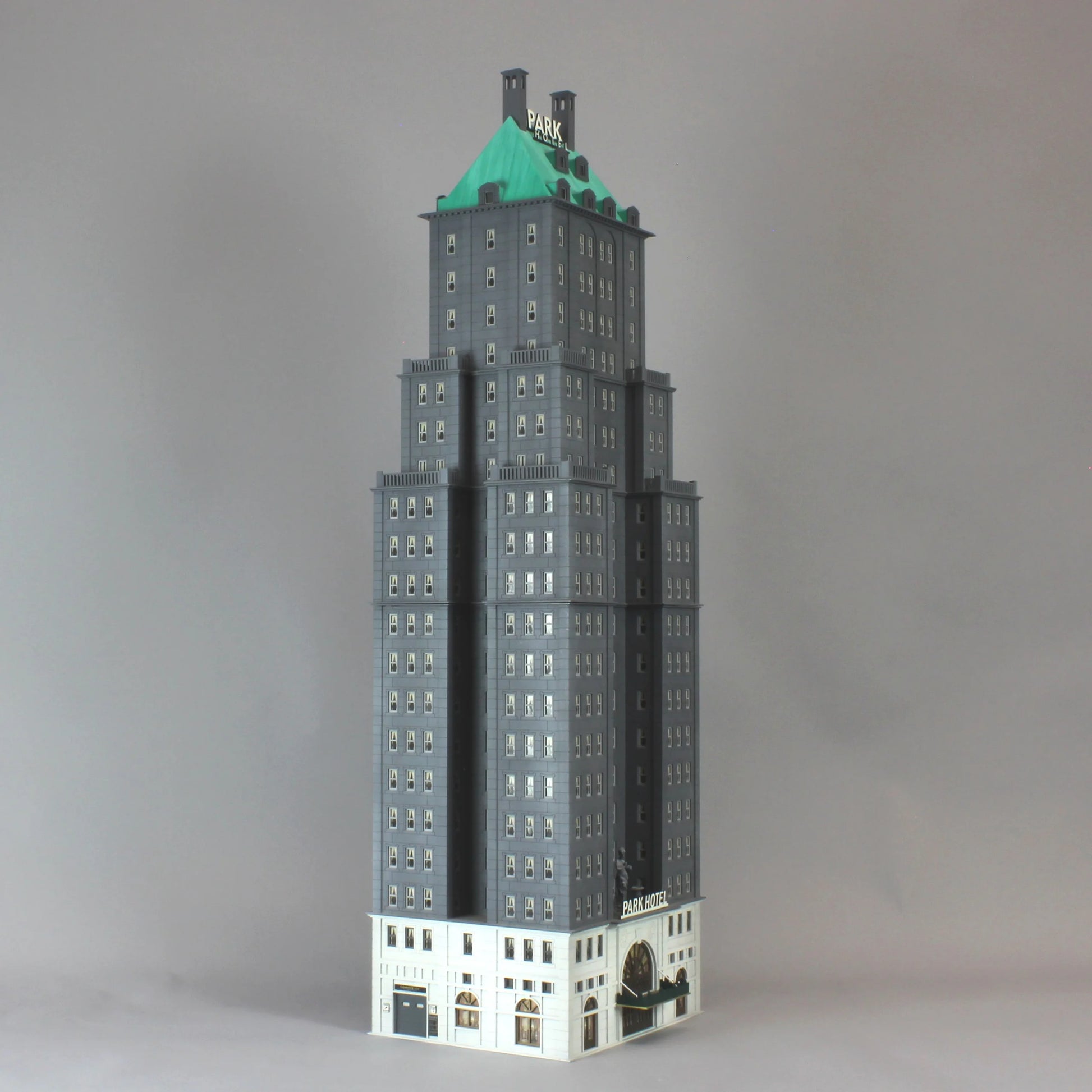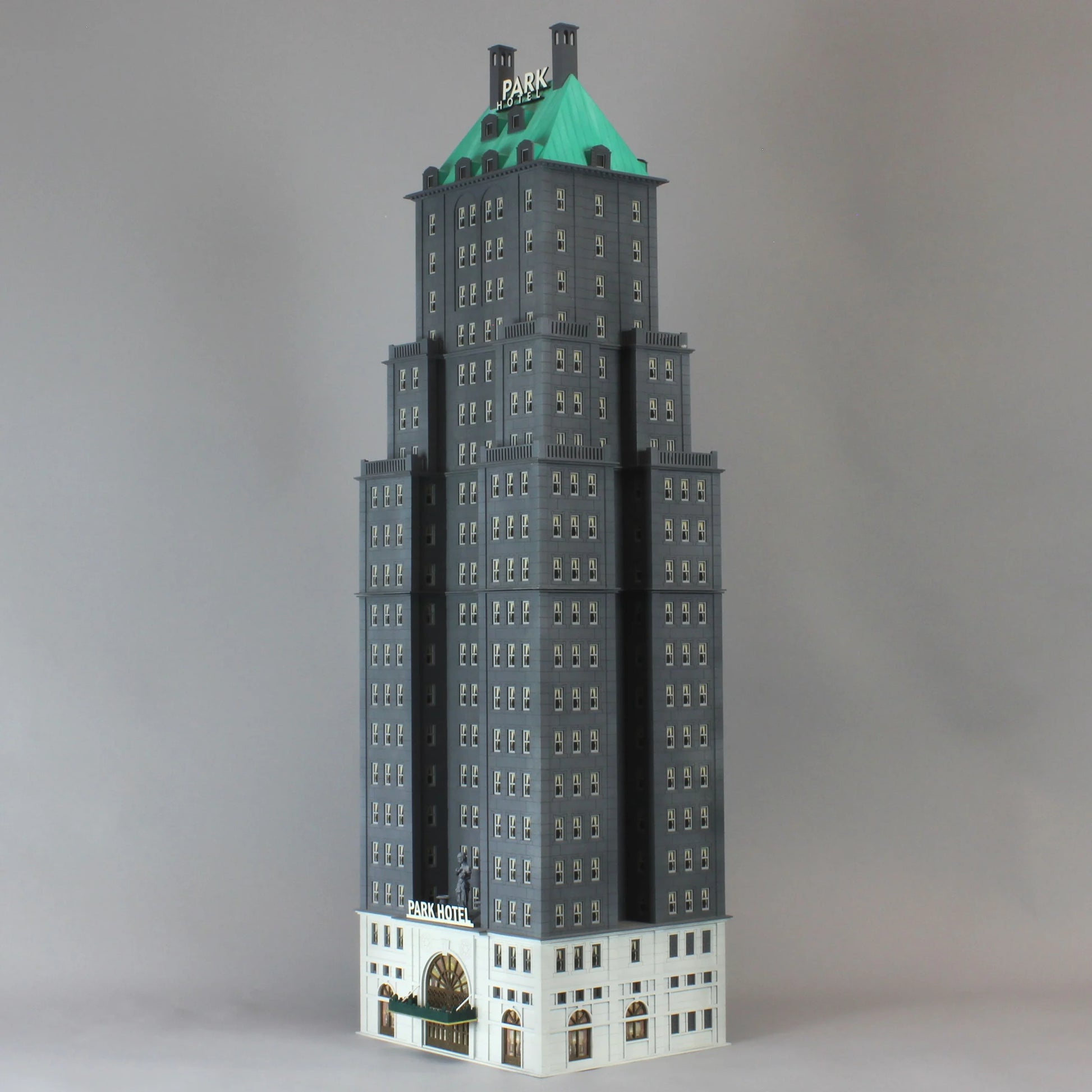 Make your model even more impressive by adding the detail kit: Park Hotel Detail Kit. This includes balconies, the statuary, urns and signs (they glow in the dark) as seen in the images below. Lighting is not included.